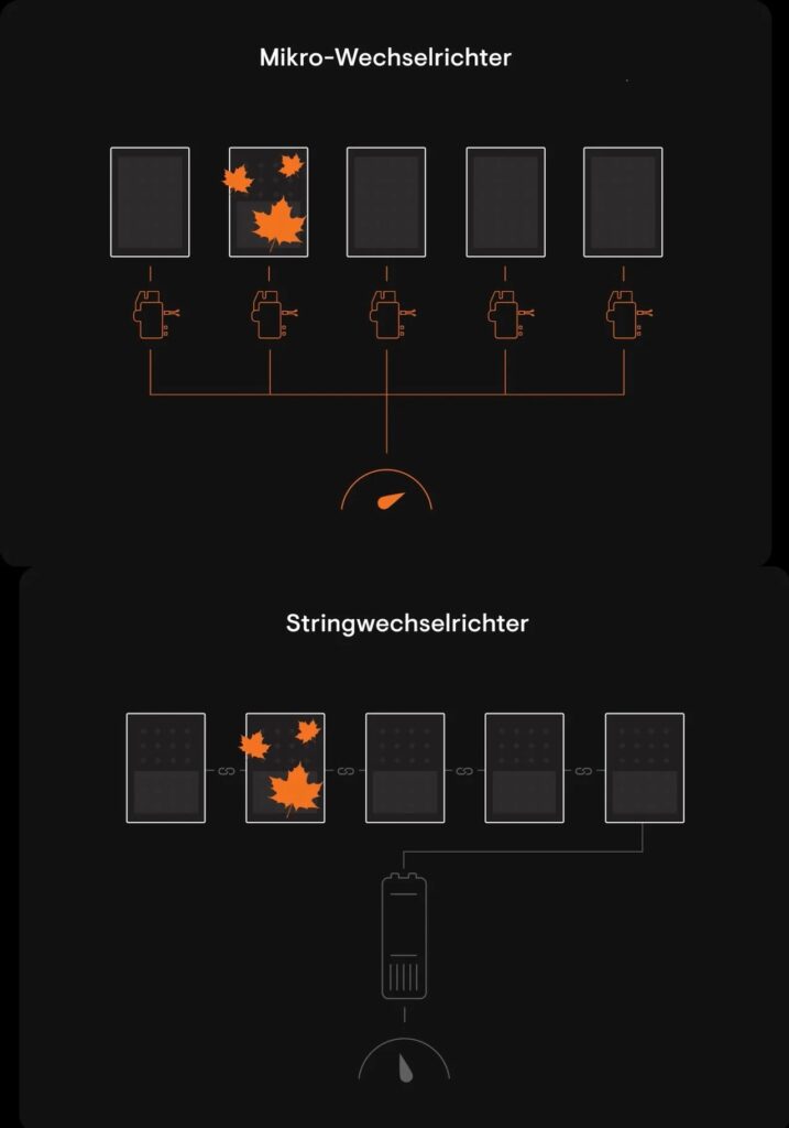 Mikro-Wechselrichter bieten maximale Leistung pro Modul. Sei es durch Laub, Verschmutzungen, Schnee oder Wolken – Verschattungen bleiben nicht aus. Bei Mikro-Wechselrichtern arbeiten die einzelnen Module jedoch voneinander unabhängig, während die Produktion bei Anlagen mit zentralem Wechselrichter auf die Leistung des schwächsten Moduls beschränkt ist.